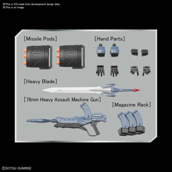 Kit contents: Heavy Blade, 76mm Heavy Assault machine gun, Magazine rack, 2 missile pods, 4 hand part sets(left/right), 3 hand expression parts, 1 set of foil and marking stickers.
