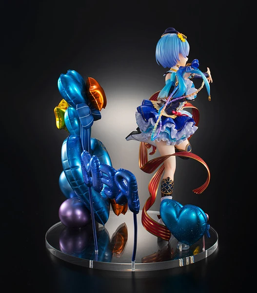 Rem is posed performing for her fans in a blue color scheme, created with great attention to detail—from the gorgeous translucent parts in her hair to the dynamic sculpt of her dress, this entire figure seems to have come to life! Surrounded by metallic balloons, Rem stands around 9 inches tall on the included clear base.