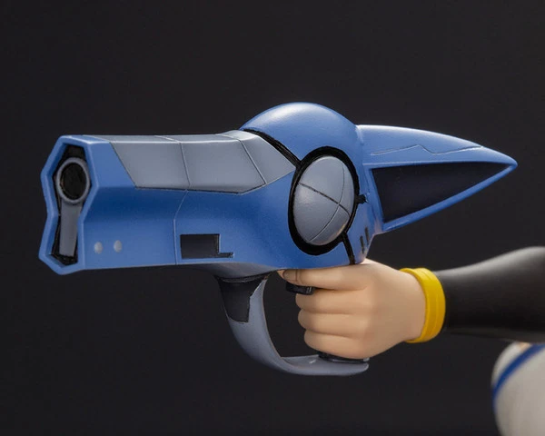 The statue’s pose is based on the key visual for the TV anime. Rebecca’s sidekick Happy, transformed into the Happy Blasters, is recreated in perfect detail. Rebecca’s robust physique is also faithfully sculpted.