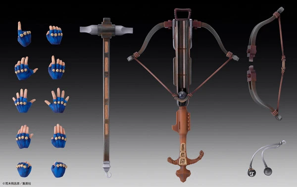 Joseph comes with two expression parts (calm and angry), 5 alternate pairs of hands, a crossbow, a hammer, a bow, and clackers. Of course, to support all of his super poses, a stand with posing arm is also included.
