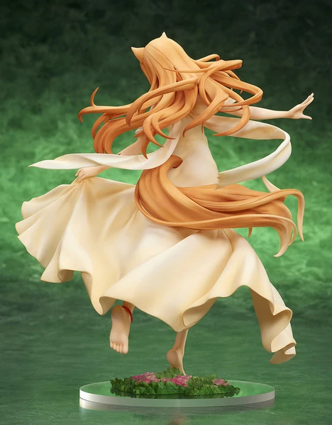 Dancing bare foot atop a bed of green grass and flowers Holo is seen wearing an elegant gown that compliments her fair smooth skin and long ginger hair, ears, and tail.