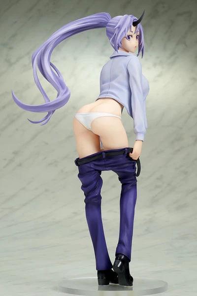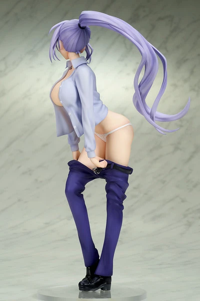 Shion is seen with her pants lowered down to her knees, panties exposed, and her blouse hanging wide open! Quickly peering over her shoulder, her long purple hair moving with the motion, she develops a blushing expression as she sees you catching a glimpse!