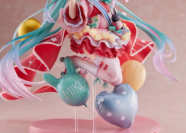 Miku is ready to party in her wonderfully frilly outfit, adorned with flowers, ribbons, and rabbit ears, while surrounded by balloons!