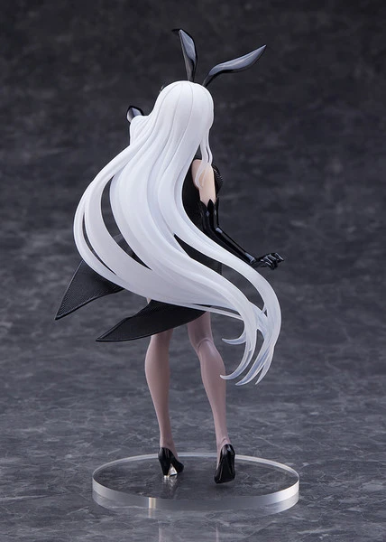 Her bright hair and skin create an interesting contrast with her beautifully detailed dark black bunny outfit.
