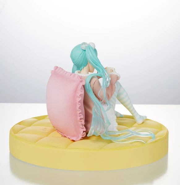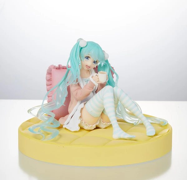 Miku is resting on a large pillow enjoying a hot drink. The colors of this version more closely resemble Miku’s original colors.