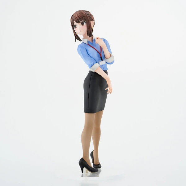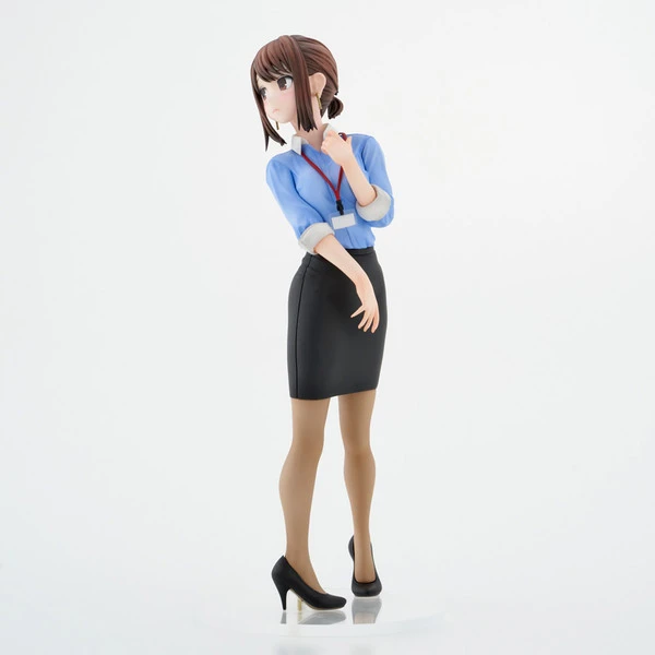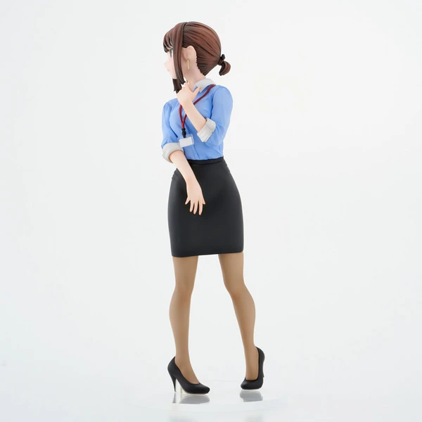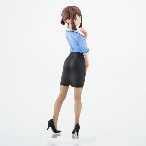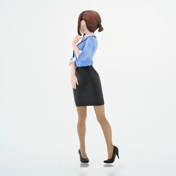 Peering over her shoulder she blushes in embarrassment as she catches you checking her out. Her blue blouse and tight black skirt show her womanly curves while her brown hair is pulled beautifully back into a bun.